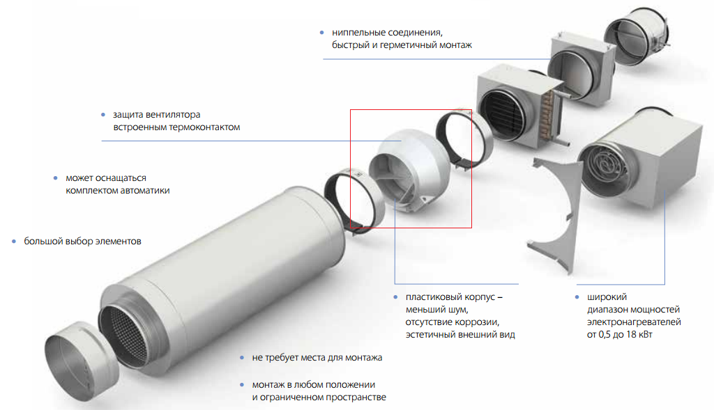 Устанавливается вентилятор TUBE 125XL в систему только с круглыми воздуховодами размером 125 мм.